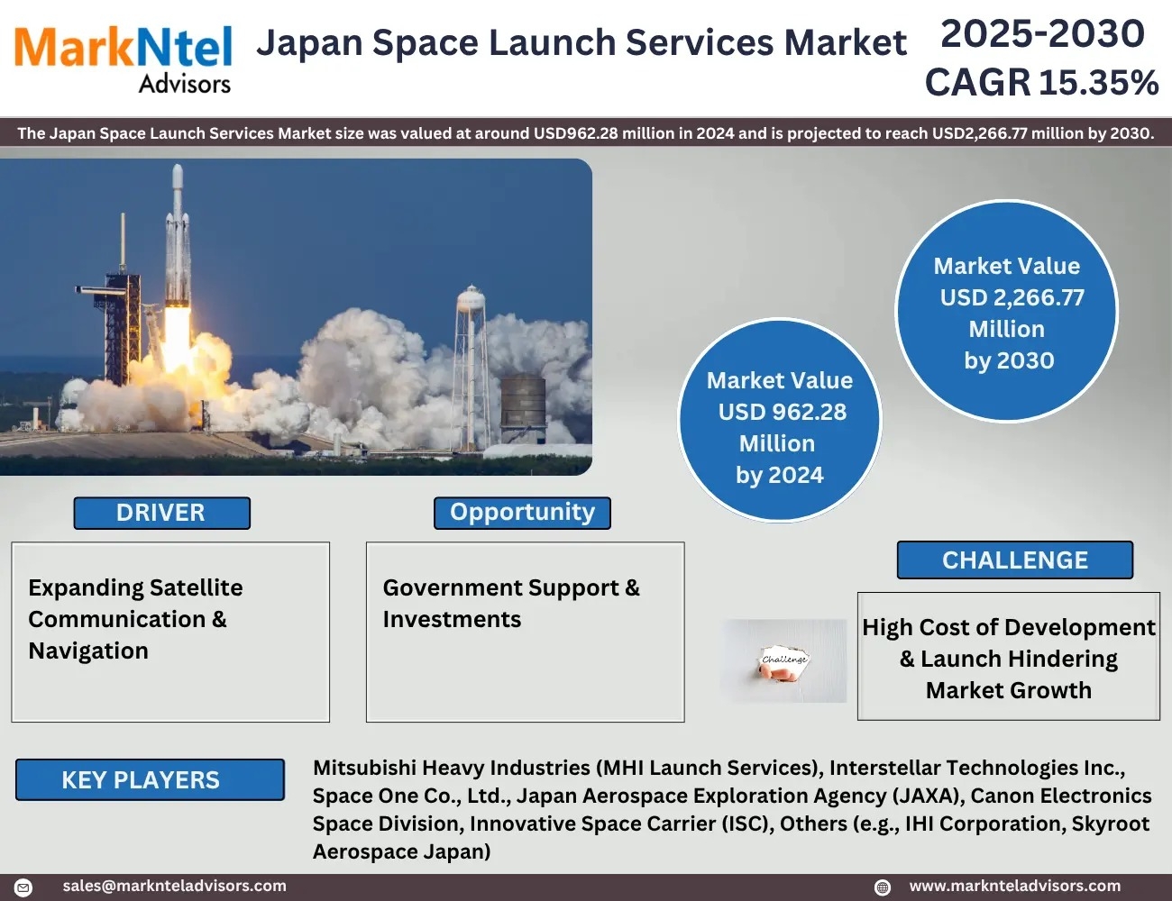 According to MarkNtel Advisors study The future of Japan Space Launch Services Market size was valued at around USD962.28 million in 2024 and is projected to reach USD2,266.77 million by 2030. Along with this, the market is estimated to grow at a CAGR of around 15.35% during the forecast period, i.e., 2025-30.