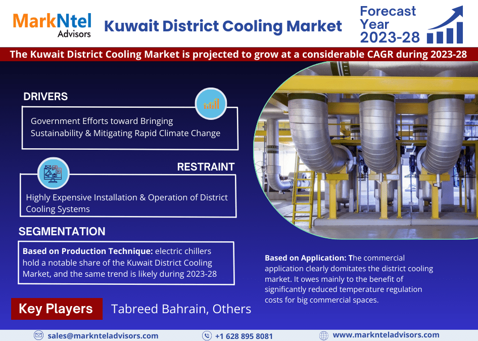 According to MarkNtel Advisors study The future of Kuwait District Cooling Market is projected to grow at a considerable CAGR during the forecast period, i.e., 2023-28. Most of the market expansion would be fueled by the ever-growing need for energy savings and the scorching summertime temperatures of Kuwait, which are augmenting the demand for energy-efficient cooling methods, where district cooling has emerged as a sustainable alternative to traditional ACs (air conditioners).